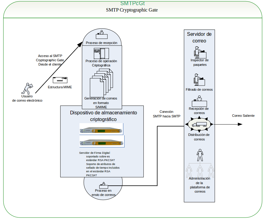 Este sistema criptográfico, además de proporcionar de forma centralizada las mencionadas funciones de firmado y cifrado, también incorpora capacidad de almacenamiento y administración segura de las claves de los certificados que se usen para llevar a cabo estas operaciones criptográficas en los correos. A su vez, garantiza que los correos emitidos son correctamente firmados y sustentados sobre la jerarquía de la infraestructura PKI que emitió los certificados digitales de firma.