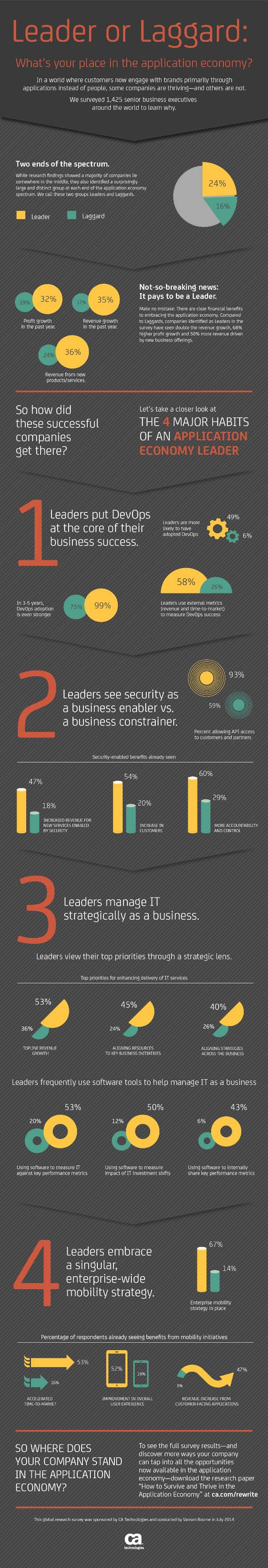 A nivel global, el estudio muestra que las empresas que implantan nuevas estrategias, como DevOps, para hacer frente a los desafíos de la Economía de las Aplicaciones están experimentando importantes beneficios en comparación con las empresas menos activas. De hecho, si se comparan los resultados de ambos grupos, los ingresos de las primeras han aumentado un 106% más que los de las segundas, sus beneficios un 68% más, y el negocio procedente de nuevos productos y servicios ha aumentado un 50% más.