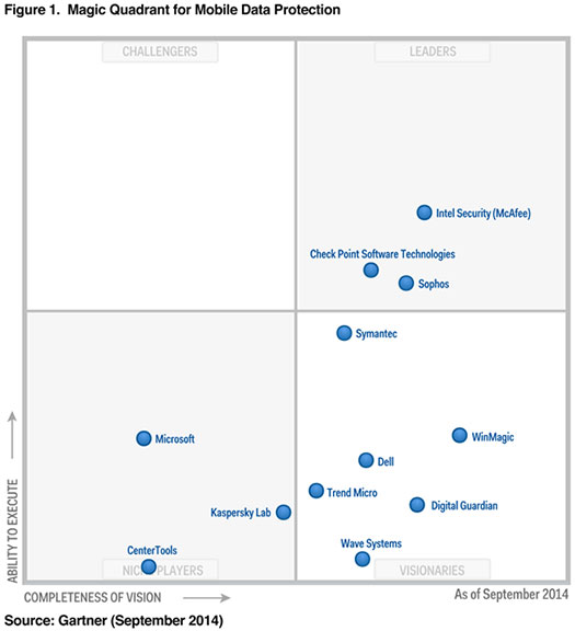 El cuadrante de líderes del informe de Gartner, en el que se encuadran los fabricantes que tienen mayor visión estratégica y capacidad de ejecución, incluye en el estudio de septiembre de 2014 referente a MDP a las soluciones de Intel Security (McAfee), Sophos y Check Point.