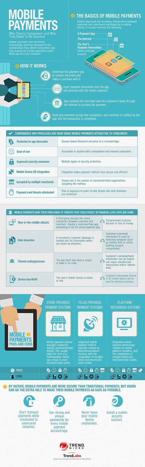 Los pagos móviles están también protegidos por medidas de seguridad. Sin embargo, se han convertido en una alternativa muy común de pago, y los delincuentes empiezan a utilizar ataques Man-in-the-middle (MitM) a través de aplicaciones maliciosas y brechas de datos que aprovechan estos nuevos métodos de pago. La aplicación en sí también podría tener una codificación que conduciría a la información bancaria. Además, si se pierde o se roba el dispositivo, los datos financieros podrían ser almacenados con fines maliciosos. Por tanto, si el usuario no es cuidadoso, sus datos y credenciales podrían terminar en las manos equivocadas.