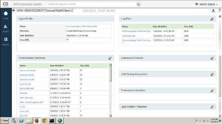 Para facilitar a los usuarios la adopción, gestión y actualización de la implementación, el nuevo APM Command Center de CA APM actúa como centro de control para la configuración de agentes. Su cuadro de mandos permite a los usuarios acceder al inventario de miles de agentes en múltiples clústeres APM, todo ello en una única vista, de forma que pueden generar informes de diagnóstico más rápidamente y también diagnosticar problemas de configuración de los agentes.