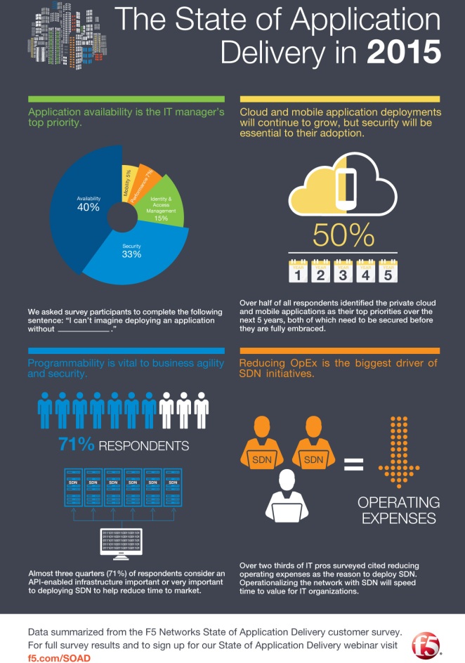 F5 Networks anuncia los resultados de su estudio 2015 State of Application Delivery. Esta encuesta ofrece una visión sobre el estado actual en la entrega de aplicaciones y confirma algunos supuestos acerca de la orientación que adoptarán las TI a partir de 2015 sobre conceptos tales como disponibilidad, seguridad, programabilidad y software defined networking (SDN) en relación con las aplicaciones.