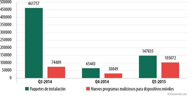 Kaspersky Lab ha analizado las amenazas móviles detectadas en el primer trimestre de 2015. Se detectaron 103.072 nuevos programas maliciosos para dispositivos móviles, lo que supone 3,3 veces más que en el cuarto trimestre de 2014.