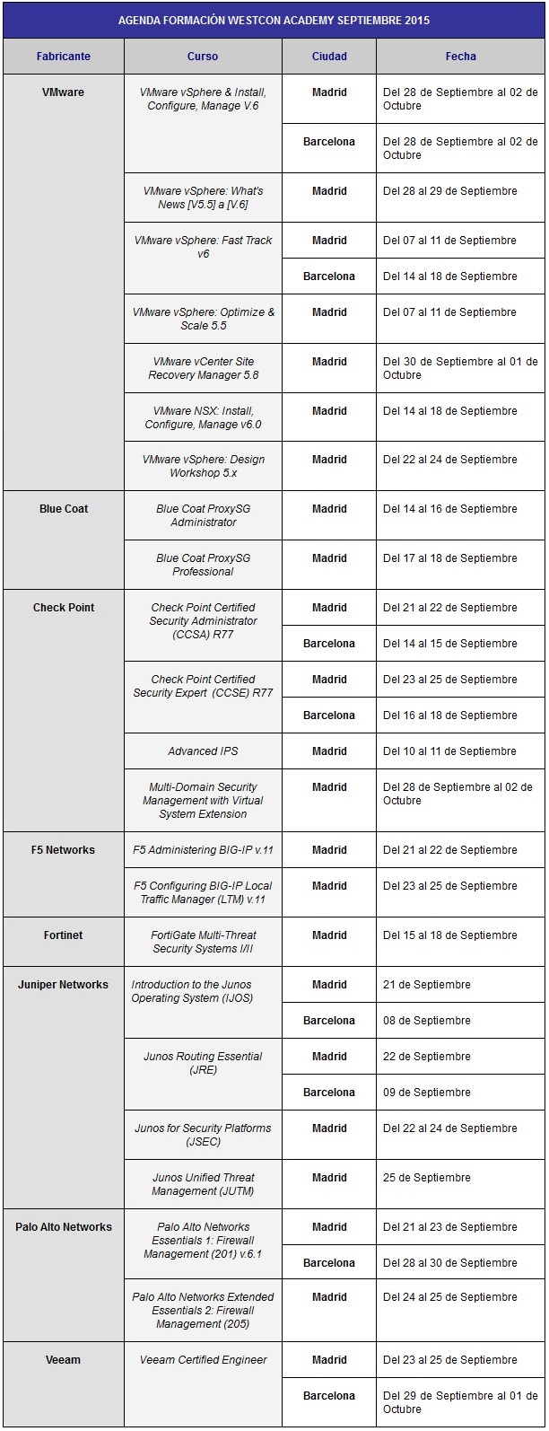 Westcon Academy dispone de un amplio calendario de cursos que se imparten en diferentes localizaciones de España, entre ellas, Madrid, Barcelona, Valencia y Bilbao. Además, la compañía ofrece formación a medida con total flexibilidad en cuanto a lugar, horario y programa.
