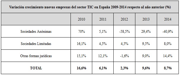 Entre las nuevas empresas dedicadas al sector TIC en España, destaca la creación de sociedades limitadas, pues es la única forma jurídica que ha experimentado crecimiento respecto al año anterior. En 2014, la creación de sociedades anónimas ha disminuido, registrando el peor dato del período, sólo superado por el de 2012.
