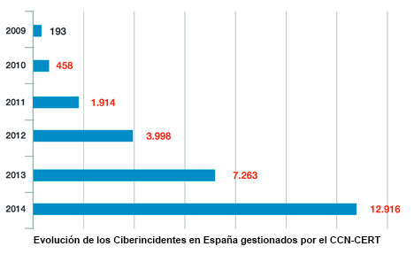 A los datos oficiales se añade la actividad del CERT Gubernamental del Centro Criptológico Nacional, que en 2014 abordó 12.916 incidentes, de los que 132 fueron catalogados como críticos. Es decir, que pueden causar degradación de los servicios para un gran número de usuarios, implicar una violación grave de la seguridad de la información, afectar a la integridad física de las personas, causar importantes pérdidas económicas, ocasionar daños irreversibles a los recursos de la organización, incurrir en delitos y/o sanciones u ocasionar un daño muy grave en la imagen de ésta.