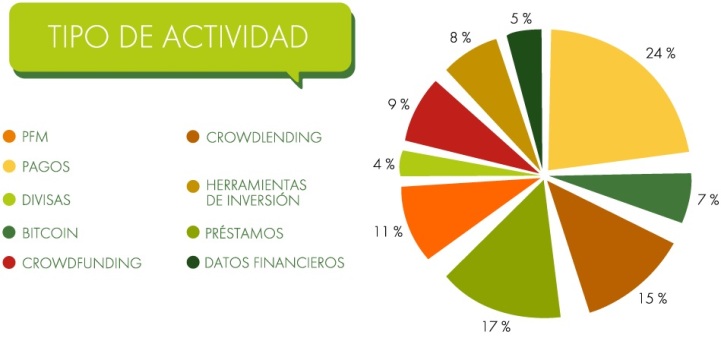 Por tipo de empresas, las especializadas en pagos y préstamos son las que concentran la mayor actividad con un 24% y un 17% respectivamente, seguidas de las dedicadas a crowdlending y los agregadores financieros, que alcanzan un 15% y un 11% respectivamente.