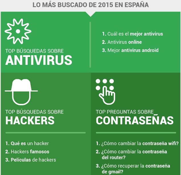 Google ha creado una infografía, a través de la cual sugiere las siguientes conclusiones: ¿Sabías que la palabra Hacker ha aumentado un 54.7% sus búsquedas y privacidad en internet, un 70,5% en 2015? ¿Te atreverías a adivinar cuáles son las contraseñas más usadas y vulnerables que utilizamos los internautas? o ¿qué le interesa saber a los usuarios cuando buscan por antivirus?