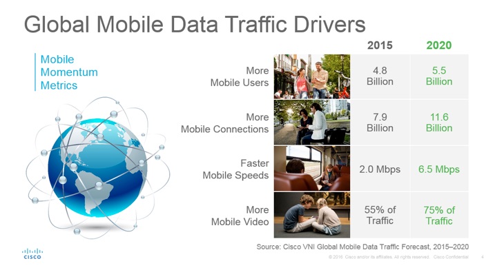 Así se desprende del Informe Cisco Visual Networking Index (VNI) sobre Tráfico Global de Datos Móviles 2015-2020, que desvela cómo la adopción de dispositivos móviles inteligentes, la mayor cobertura móvil mediante redes 4G y la creciente demanda de contenido incluyendo vídeo multiplicarán por 8 el tráfico global de datos móviles en los próximos cinco años. En España, el tráfico global de datos móviles se multiplicará por 7 en dicho período.