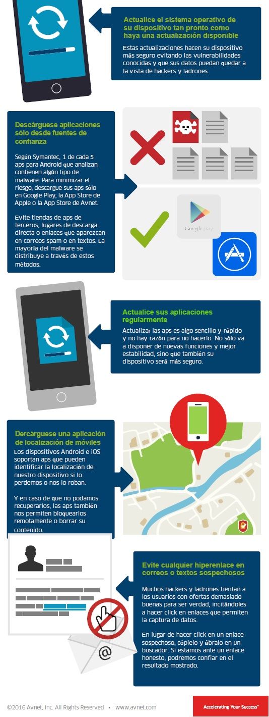 Por supuesto, usamos claves y patrones para impedir el acceso a nuestro terminal. Pero Avnet nos ofrece una infografía con 5 pasos sencillos para mantener nuestros dispositivos móviles, y la información sensible que contiene, lo más seguros posibles.